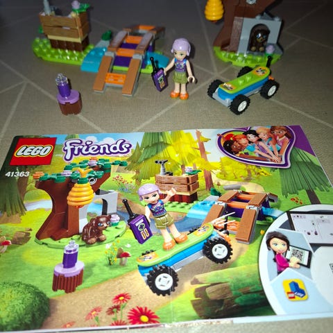 LEGO Friends 41363 legetøjssæt med forskellige byggeelementer inklusive en figur, skateboard, træ, bro og tilbehør. Sættet indeholder farverige klodser og dele til kreativ leg og konstruktion.