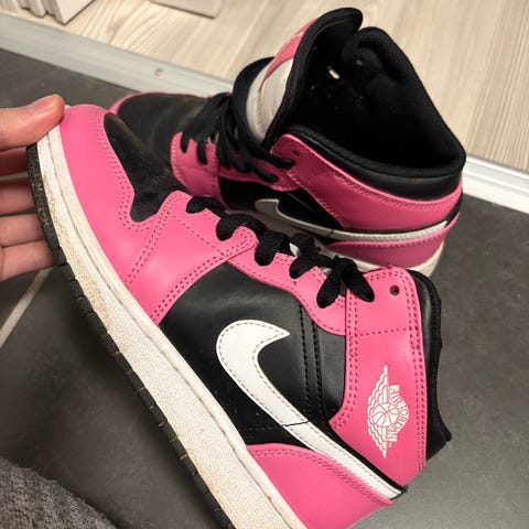 Air Jordan sneakers i størrelse 38,5 med farverne rød, sort og hvid. Skoene har en klassisk design og er lavet af materialer, der er velegnede til hverdagsbrug og sport.