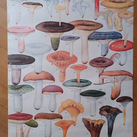 Botanisk plakat med sort og hvidt motiv af forskellige botaniske former. Plakaten viser detaljerede illustrationer af planter og svampe i grafisk sort-hvidt design.