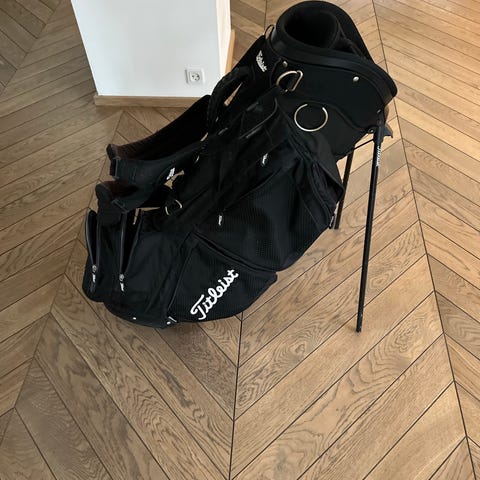 TaylorMade golfbag i blå og sort farve med flere lommer til opbevaring.