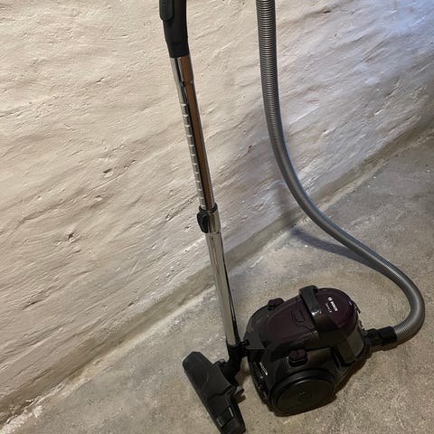 Bosch støvsuger med tilhørende slange og mundstykke. Enheden er hvid med sorte detaljer og har hjul til nem transport. Velegnet til almindelig rengøring af gulve og tæpper. 2 stk nye poser medfølger. Sælges da vi har fået en ny
