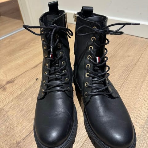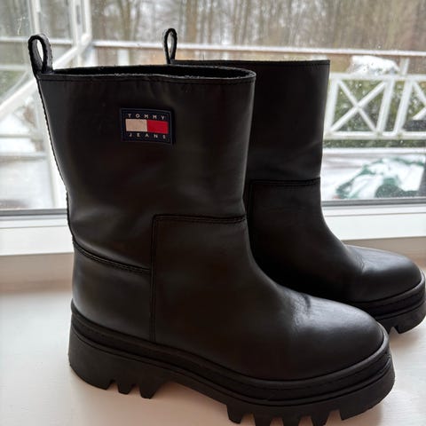 Tommy Hilfiger støvler i sort læder i størrelse 39. Støvlerne har en enkel og klassisk design.