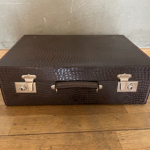 Lille guldfarvet kuffert.