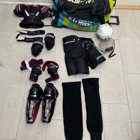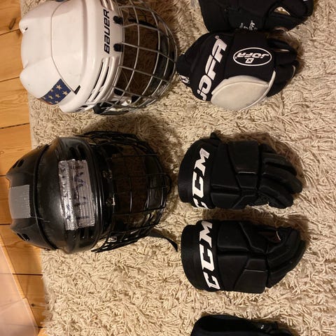 Komplet Bauer/CCM Ishockeyudstyr sæt bestående af skøjter i str 29,5 , to hjelme i rød og hvid i str YT og S, hockeybukser i størrelse medium til str 5-7 år, handsker, 2 stave og anden beskyttelsesudrustning. Udstyret er designet til ishockey og inkluderer flere nøgleelementer til sporten.