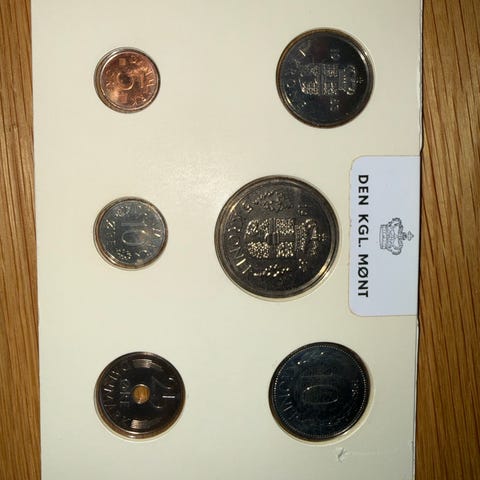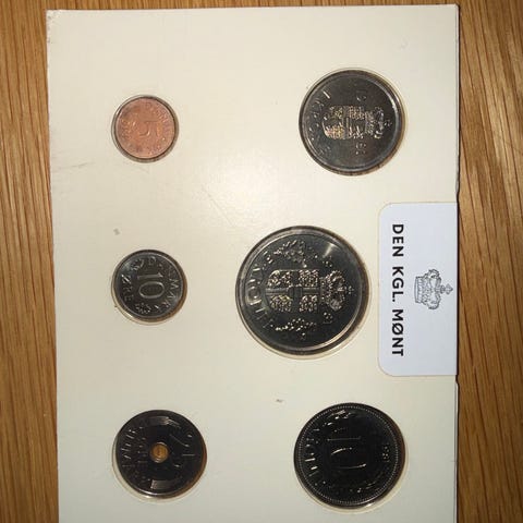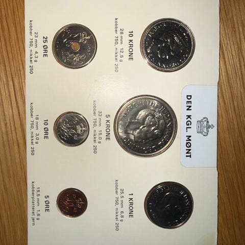 Den Kgl. Mønt møntsæt med forskellige danske mønter i flere størrelser og værdier. Sættet indeholder 5 øre, 10 øre, 25 øre, 50 øre, 1 krone og 2 kroner mønter med traditionelle danske motiver og udformninger.