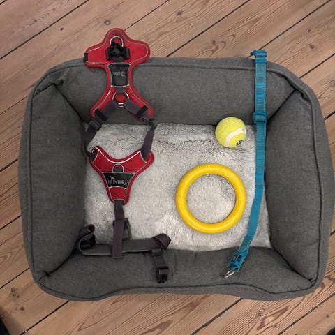 Da vores egen lille pelsbold ikke får brugt disse ting længere skal det videre. Den store taske har tydelige brugsspor i bundpladen, ellers er resten fint, gives væk så andre nemmere kan få glæde af det :)