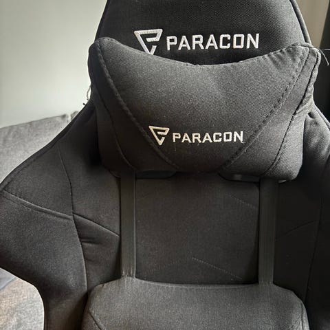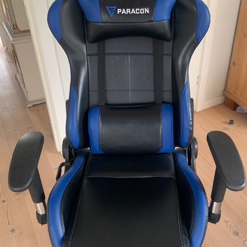 Paracon gamingstol i sort og hvid farve med polstret sæde og ryglæn. Stolen har justerbare armlæn, nakkepude og lændestøtte. Designet til brug ved skrivebord med hjul til nem bevægelse.