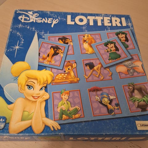 Billedlotteri med motiver fra Disney Princess. Emballagen (æsken/kassen) er noget slidt, men hverken plader eller brikker fejler noget.