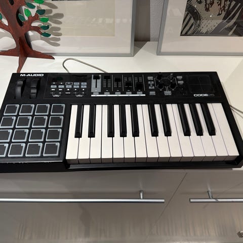 M-Audio Oxygen 8 MIDI keyboard controller med 25 tangenter i sort og hvid. Kompakt og bærbar design til musikproduktion og live-optræden.