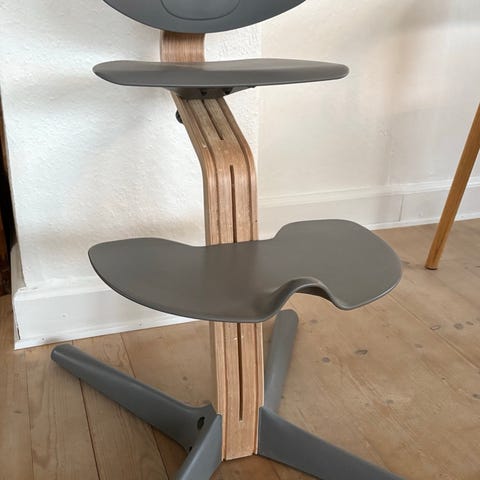 Stokke højstol designet til børn. Stolen har en justerbar sidde- og fodplade med hvidt sæde og trækonstruktion. Egnet til brug som børnemøbel til spisning og aktiviteter.