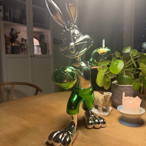 Den har desværre tidligere været tabt, og handskerne er ødelagt. Det giver figuren et lidt anderledes "udtryk", men når den står på en hylde eller i et skab, er det noget, man bemærker i en mindre grad. Derfor sælges den langt under markedsprisen. God mulighed for en køber, der enten kan leve med det eller ønsker at reparere/restore.