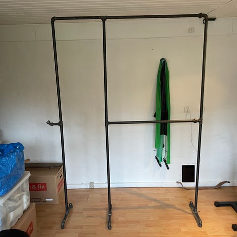 Tøjstativ lavet af vandrør fra mærket rackbuddy. Sort.