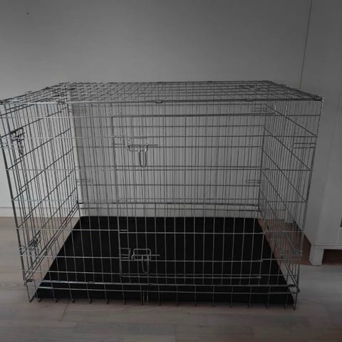 Metal hundebur med håndtag og dør. Buret er lavet af metaltråd med en bundplade. Designet til at give et sikkert og ventileret rum til hunde.