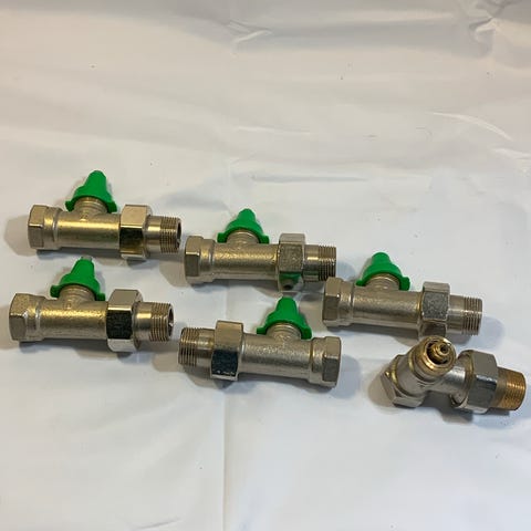 Sæt med ventiler til radiator i messing. Ventilerne har gevindtilslutninger og er designet til styring af varmeflow i radiatorer.
