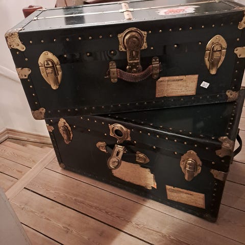 Gammel mørkegrøn rejsekuffert med masser af patina. Har tilhørt en Jørgen Andersen, som for mange år siden taget rejsen fra København til New York via Hull og Liverpool. Den fremstår med masser af patina. Kan dog stadig fungere som opbevaringskiste.