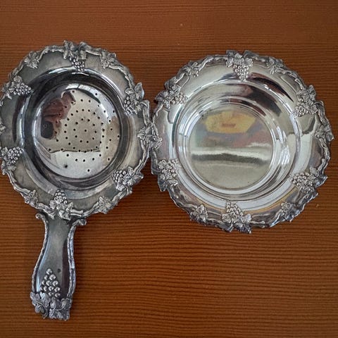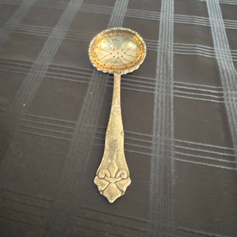 Fin lille tesi i pletsølv. Dekoreret med franske liljer. Trænger til at blive pudset.