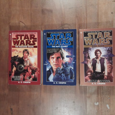 Amerikansk og britiske paperbacks i flot stand omhandlende The Corellian Trilogy fra Bantam Books fra omkring 1995.