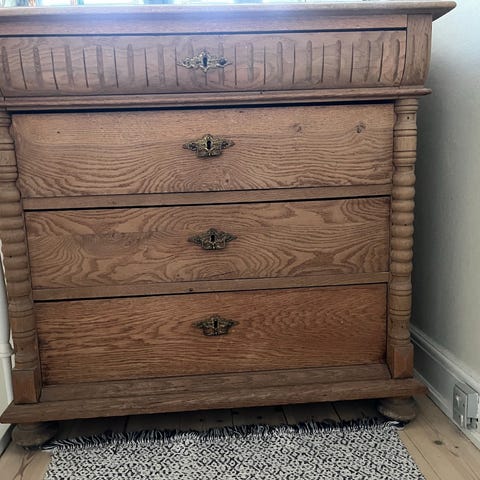 Rigtig fin antik 4 skuffet kommode fra større gård (v/Kerteminde) Er fint velholdt, afsyret fyrretræ og ludbehandlet. Fine detaljer/ornamenter - så som støbte fine messing nøglebeslag samt håndtag der afskiller sig fra mange andre - samt kuglefødder foran. Størrelse L94 B/D49 H92cm