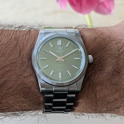 Det kommer med et automatisk urværk og er som ubrugt. Traska er et amerikansk mikro mærke som bruger en hærdningsproces på deres stål som gør det hårdere en selv Rolex stål.