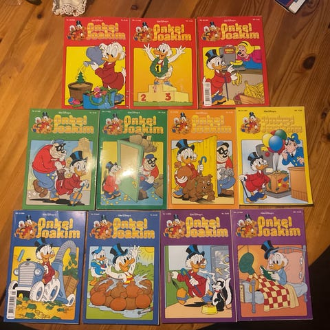 Samling af Onkel Joakim og Disney tegneserieblade i forskellige udgaver og numre. Indeholder klassiske historier med kendte figurer som Onkel Joakim, og Bjørne-Banden. Tegneseriebladene er velegnede til samlere eller læsere med interesse for Disney-tegneserier.
