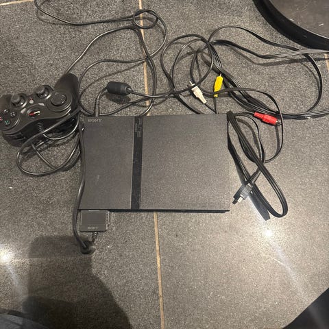 Playstation 2 spillekonsol. Sort farve. Kompatibel med Playstation 2 spil. Inkluderer diverse spil og tilbehør som hukommelseskort (