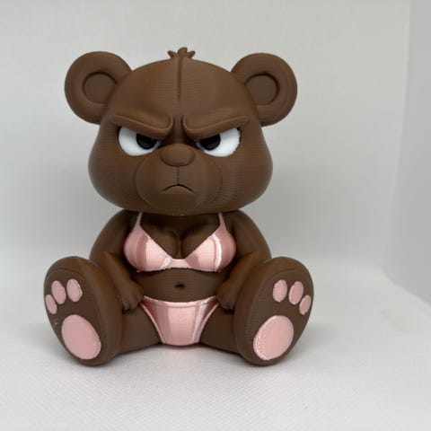 To teddybjørne med tøj, hvor den ene bærer en brun kjole med blomsterdetalje og den anden har stribet overall.