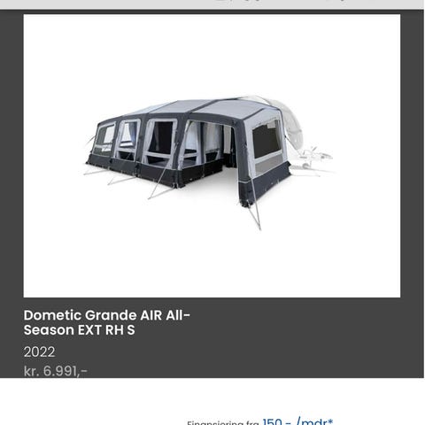 Kun brugt 2 gange. I fin stand. Med luftpumpe og pløkker. Stadig garanti. Kvittering haves. Købt 1/4 25. Sælges da vi har skiftet campingvogn der har fast markise