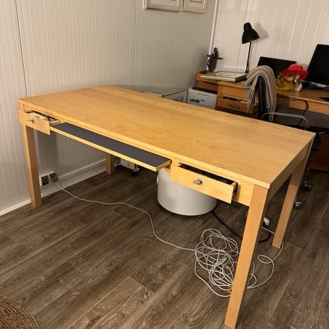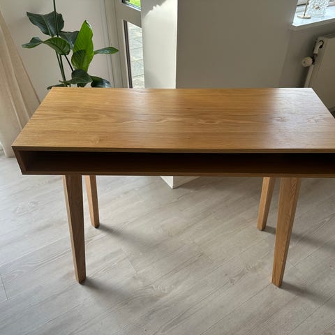 Perfekt til hjemmearbejdspladsen. Skrivebord i egetræ finer med to skuffer der er 34cm brede.