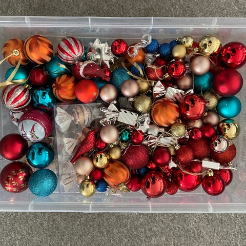 Julepynt bestående af julesne mennesker, juletræer, kugler og julemand figurer i forskellige farver og designs. Velegnet til dekoration i julen.
