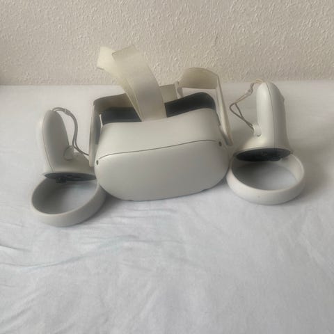 Oculus Quest 2 VR-headset med to controllere og oplader. Headsettet er hvidt med justerbare stropper og inkluderer nødvendige kabler til opladning og tilslutning. Velegnet til VR-spil og oplevelser. Der medfølger også et blåt cover og 2 par linser med -2 og -8 i styrke, så man kan bruge istedet for at man skal bruge briller. Hukommelse er på 128gb