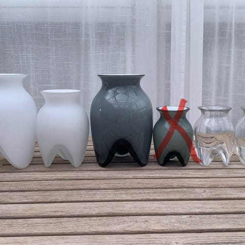 Vasen har et lille hul i bunden, så kan ikke holde vand, men er ellers i fin stand uden afslag på kanten og kan bruges til dekoration eller tørrede/kunstige blomster
