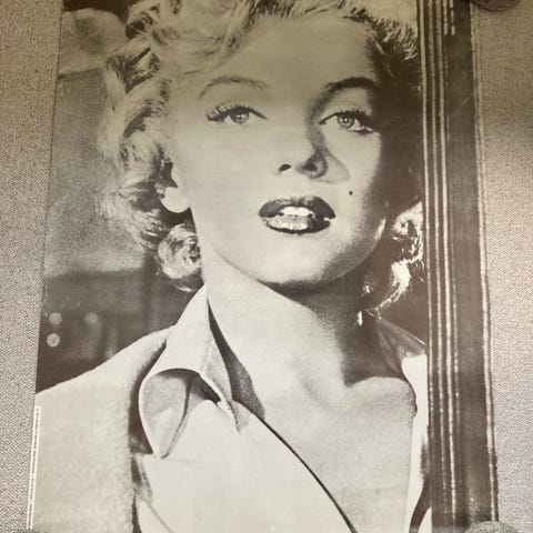 Marilyn Monroe plakat med motiv fra filmen Bus Stop. Sort-hvid billede af Marilyn Monroe siddende ved en busstop med en taske og kuffert. Plakaten har en klassisk og ikonisk stil.