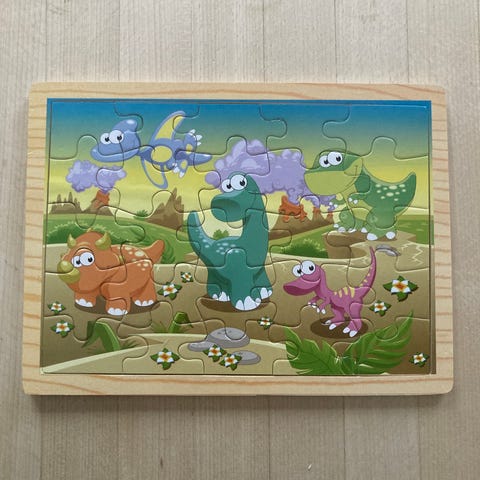 Happy Dinosaur børnepuslespil bestående af 3 puslespil med dinosaurmotiver. Puslespillene har forskellige størrelser og farverige illustrationer, designet til de mindste