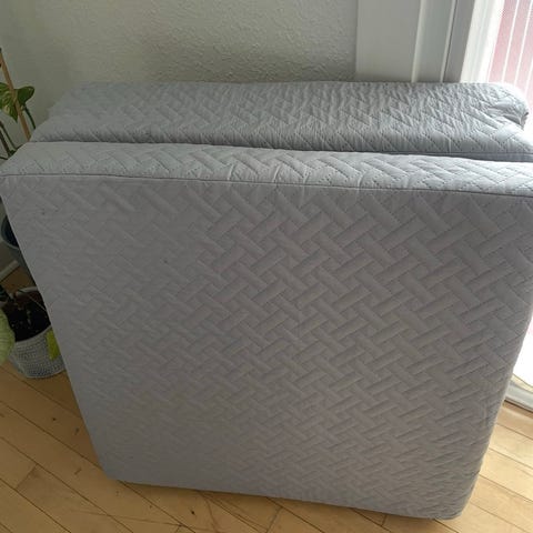 Den er kun brugt med lagen på meget få gange, og kan nemt foldes sammen.
