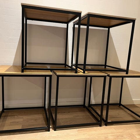 Mål: H50-L45-B45 cm, der er lidt brugsmærker på nogle af dem (småridser i pladen) Kantebåndet er lidt i stykker på 2 af dem og ved en af dem er det løsnet lidt i hjørnet. (Se billedet) Ellers fremstår de i fin stand. Fra røg-/dyrefrit hjem. Prisen er pr stk.