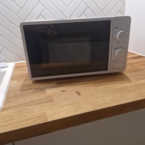 Sharp mikrobølgeovn i hvid farve. Mikrobølgeovnen har standardfunktioner til opvarmning og tilberedning af mad. Den er designet til almindelig husholdningsbrug.
