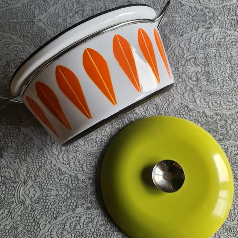 Stor gryde, ca 3 liter, diameter 24 cm, rødbrun dekoration, rødt aluminiumslåg. Designet af Grete Prytz Kittelsen. Enkelte brugsspor på hvide emalje under håndtagsklemmen. Sender gerne med DAO.