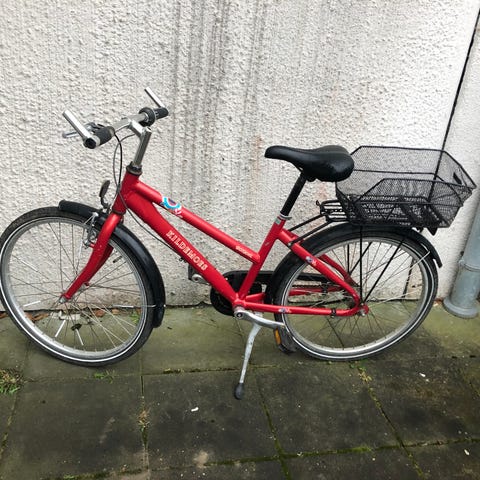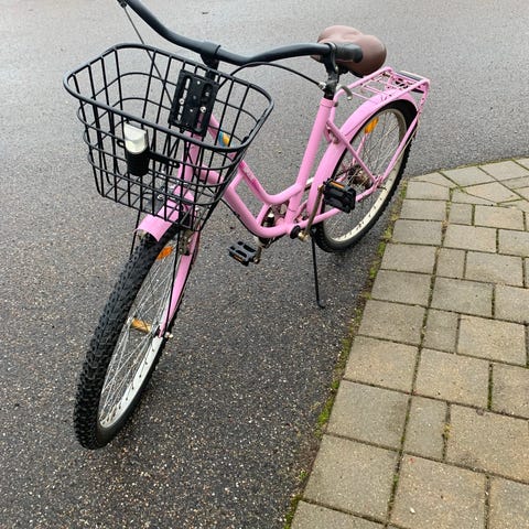 En rigtig fin laksefarvet Kildemoes pige cykel med 38cm stel og 24 tommer hjul. Velholdt og kører godt. Den er udstyret med 3 gear fra Sram (I-motion 3), fastmonteret kurv, bagagebærer, metal skærme, gode dæk, reflekser og støttefod. God kvalitetscykel fra danske Kildemoes.