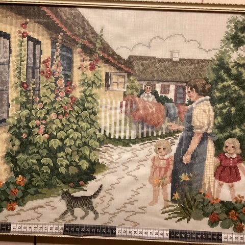 Korsstingsbroderi i guldramme. Måler 25x35 cm ned ramme. Meget charmerende og i fin stand. Pris kr 85 afhentet Kbh Ø. Forsendelse kr 60