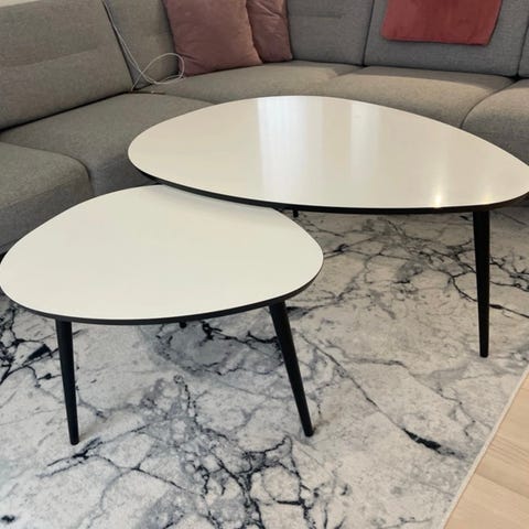 Dråbeformet sofabord fra Daells Bolighus. Hvid plade med sorte ben. Brugt, men uden synlige skræmmer eller ridser. Benene kan skrues af for nem transport.