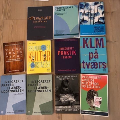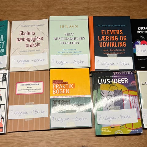 Jeg sælger mine fire bøger til læreruddannelsen. De repræsenterer fagene idræts, pædagogik og UTE/dansk som andet sprog.