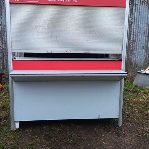 Udendørs salgsbod med bambusbeklædning og rustfri bordplade. Bodens overflader består af rustfrit stål, og den har en opbevaringssektion under bordpladen. Designet til at kunne foldes sammen eller åbnes for nem brug og opbevaring. Er åben for bud