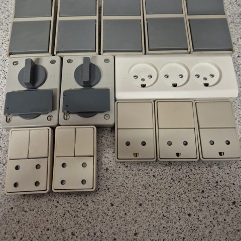 Sæt med forskellige el-installationskomponenter, herunder to røde og grønne stikdåser, en hvid installationsboks og tilbehør i original emballage. Komponenterne er velegnede til elektriske installationer.