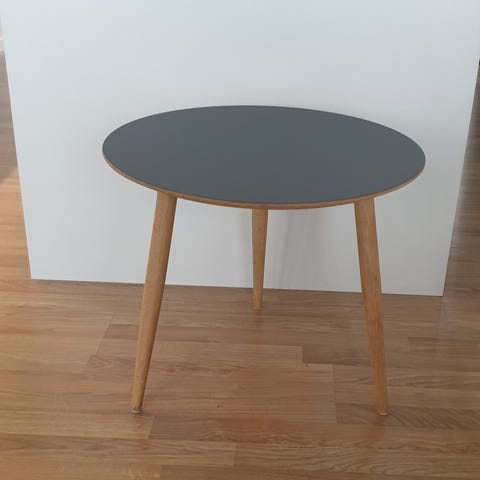 Trebenet lille sidebord med rund hvid laminatbordplade, der bærer præg af brug, men som ikke er voldsomt skrammet.
