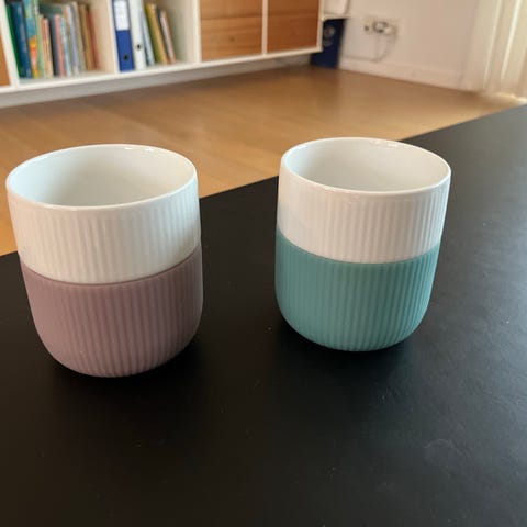 Royal Copenhagen kop i porcelæn med turkis og hvid farve. Koppen har et enkelt design med rillet overflade på den hvide del og glat turkis bund. Velegnet til servering af varme drikke.