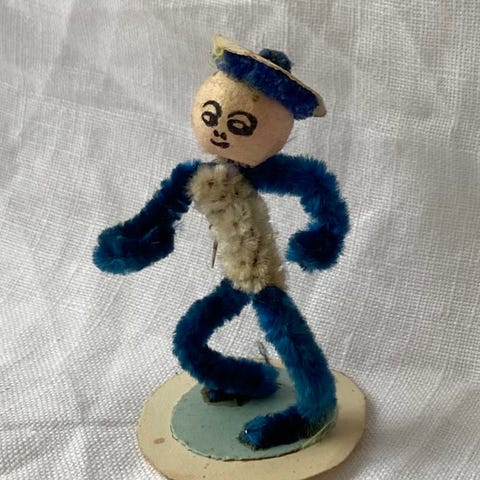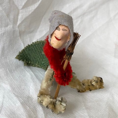 Gammel, håndlavet vintage heks udført i piberensere/chenille med rød hætte og vævet grøn kappe. Hoved i papmaché/composition med håndmalet ansigt — typisk for tysk/tjekkisk værkstedsarbejde fra perioden. Figuren har den karakteristiske siddende/heksestilling og stammer fra ca. 1950–60’erne.