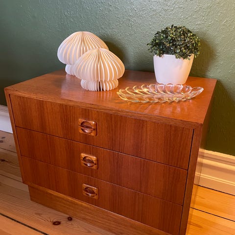 Vintage skab/sidebord i teak fineret træ med flotte åretegninger og dekorativ kantliste. Står på elegante, høje ben. Låge med rummeligt opbevaringsrum – perfekt som natbord eller entréskab. Pæn stand med almindelige brugsspor. Stabilt og funktionelt.