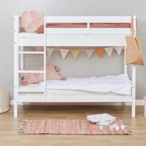 Hvidlakeret køjeseng med stige og stor skuffe under. Kan også bruges som to enkeltsenge.
