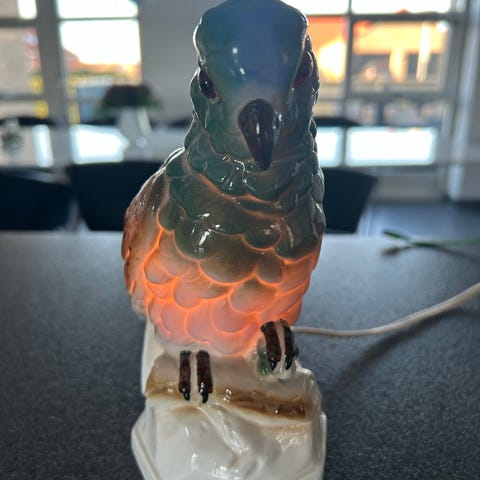 Rigtig flot kakadue som ikke er helt så stor som de normalt er. Der er ingen skår eller revner. Og den virker som den skal