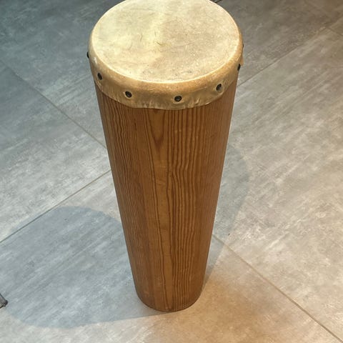 Solid håndlavet tromme i træ og skind. Kaldes også for pædagogtromme, da denne type trommer er meget brugt i skoler og børnehaver.